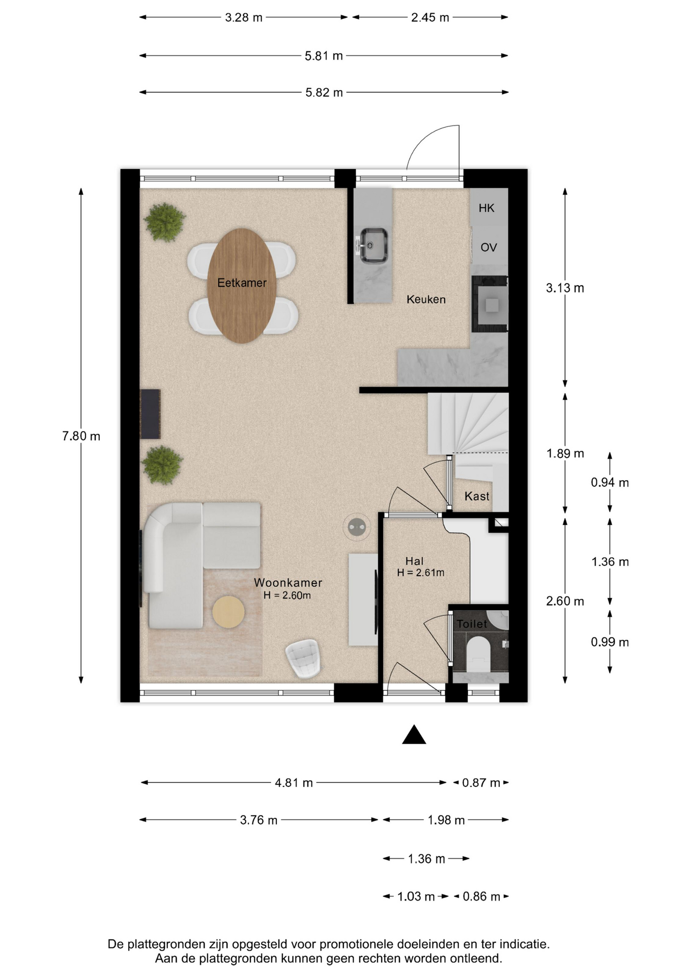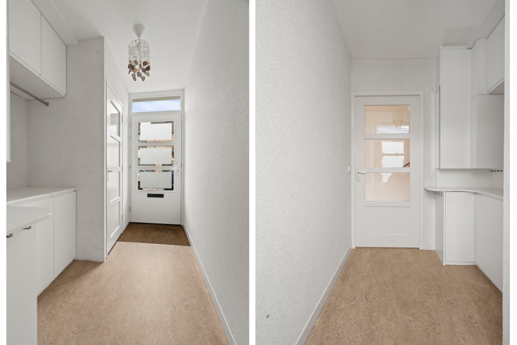 Je betreedt de woning via een ruime hal met voldoende plaats voor een garderobe. Vanuit hier heb je toegang tot het verzorgd afgewerkte toilet. Zodra je de woonkamer binnenstapt, valt direct de ruimte en de prettige lichtinval op. Woningen uit de jaren ’70 staan bekend om hun doorzonwoonkamers met grote raampartijen, en dat is hier duidelijk terug te zien. Dankzij de open indeling voelt de begane grond bijzonder ruimtelijk aan.