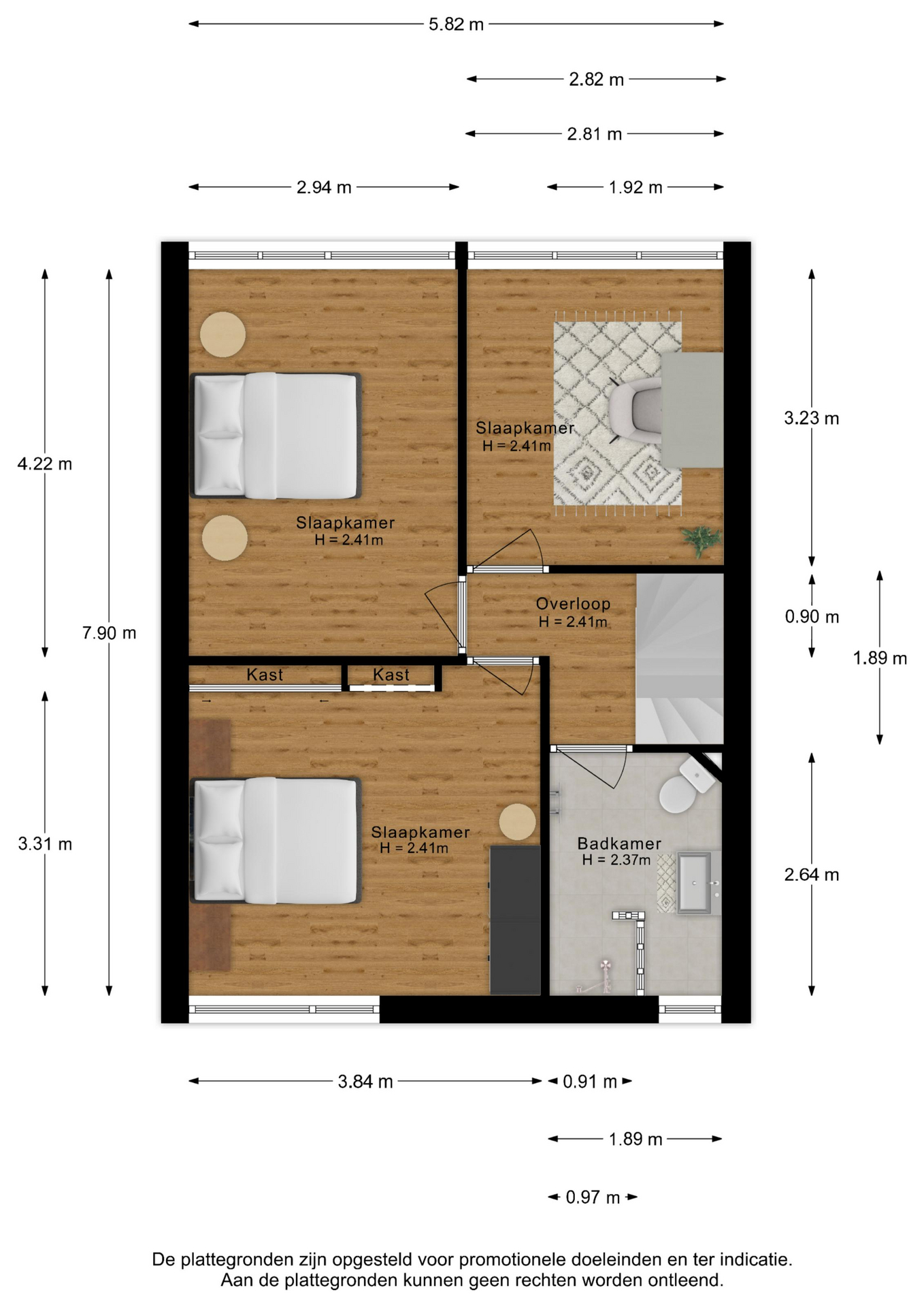 Op de eerste verdieping bevinden zich drie slaapkamers en de badkamer. Van een ‘kleine kamer’ is hier geen sprake: alle slaapkamers zijn ruim bemeten (circa 9 m², 12 m² en 13 m²). Twee slaapkamers liggen aan de achterzijde en één aan de voorzijde van de woning. De badkamer is netjes en neutraal uitgevoerd en beschikt over een tweede toilet, een ruime inloopdouche en een wastafelmeubel.
