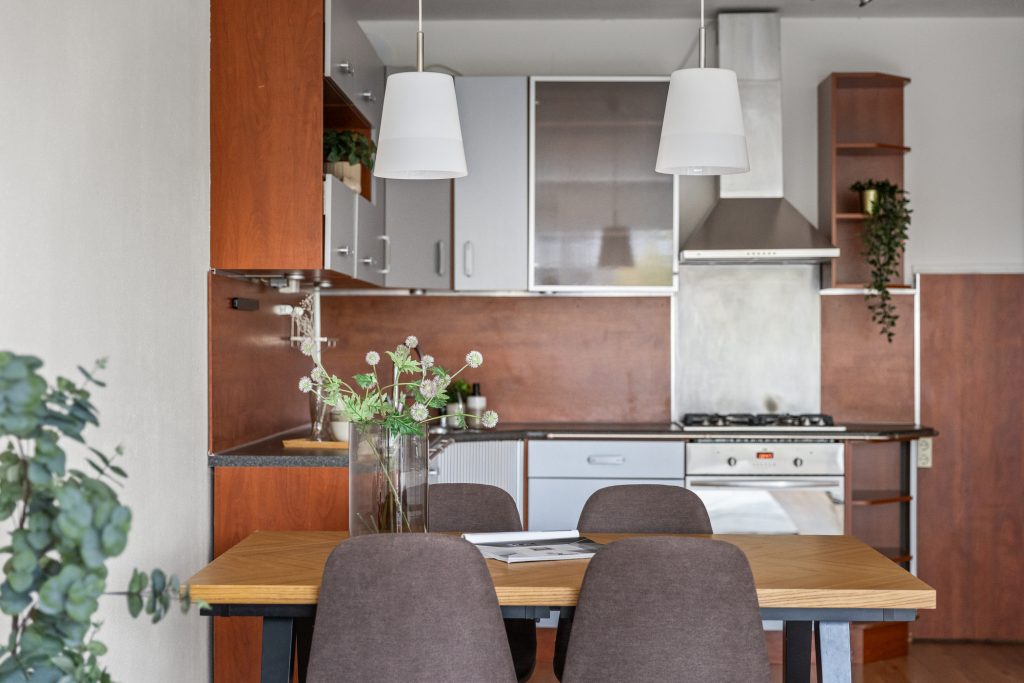 Aan de rechterkant stap je het woongedeelte binnen. Hier bevindt zich de open, functionele keuken die is voorzien van diverse inbouwapparatuur. De keuken is wat gedateerd, maar nog volledig functioneel. Tegelijkertijd biedt deze ruimte volop mogelijkheden om hier een prachtige, moderne keuken te realiseren, een plek waar elke hobby-kok zich helemaal thuis zal voelen.