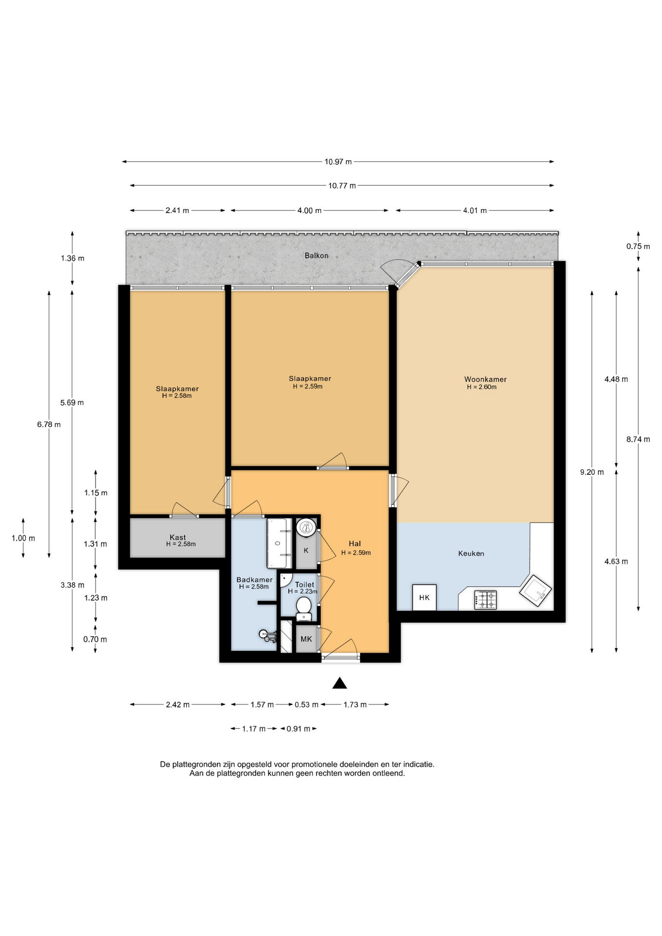 Het appartement is praktisch ingedeeld. Vanuit de hal heb je toegang tot twee ruime slaapkamers en de badkamer. Beide slaapkamers liggen, net als de woonkamer, aan de balkonzijde.