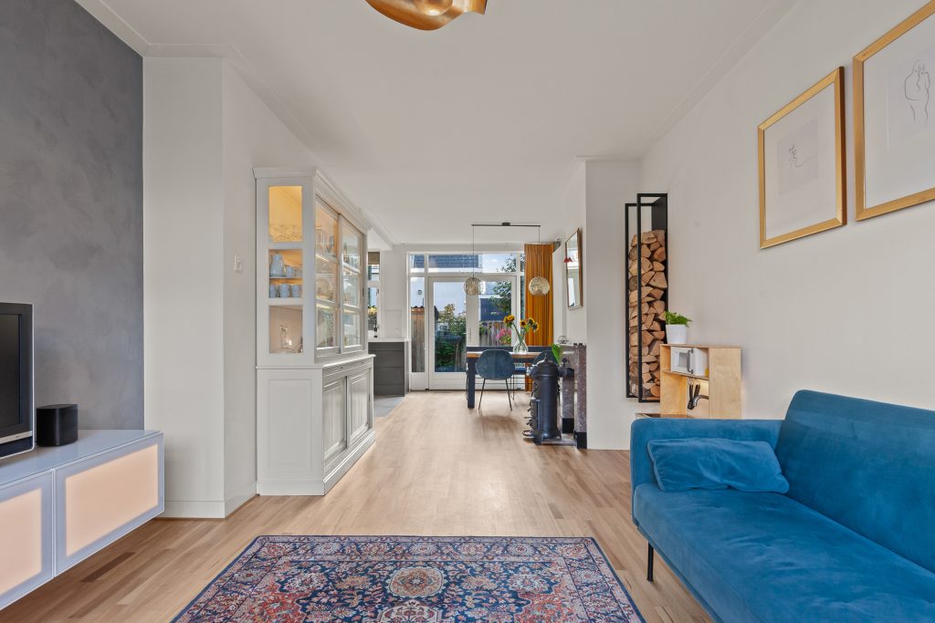 De doorzonwoonkamer is een open en lichte ruimte met een mooie iepenhouten vloer en strak afgewerkte wanden en plafonds. Er is plek voor een royale zithoek en eethoek, en de erker met glas-in-lood zorgt voor extra sfeer en charme.