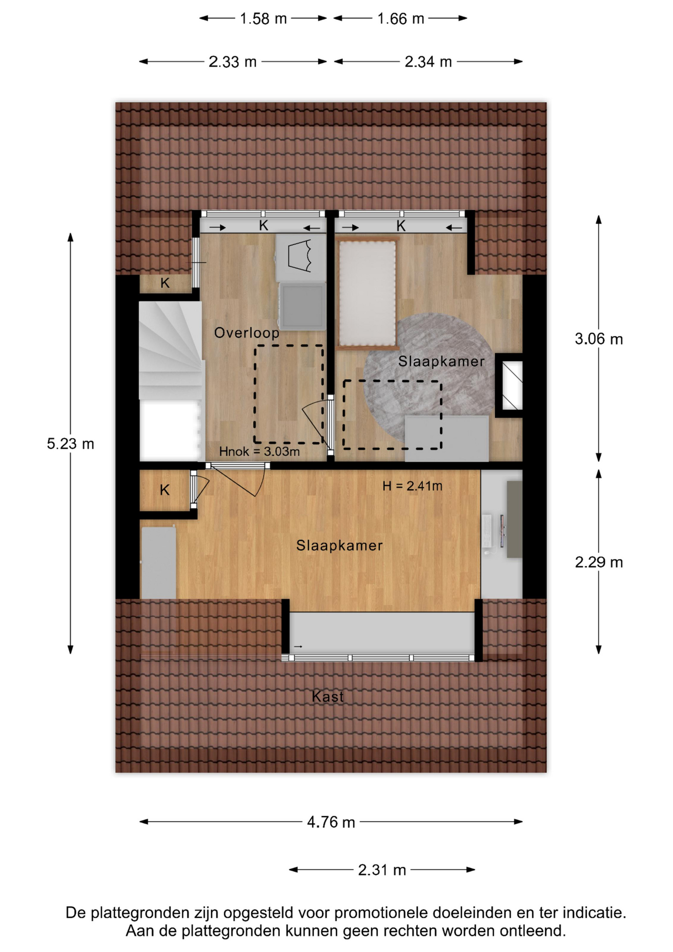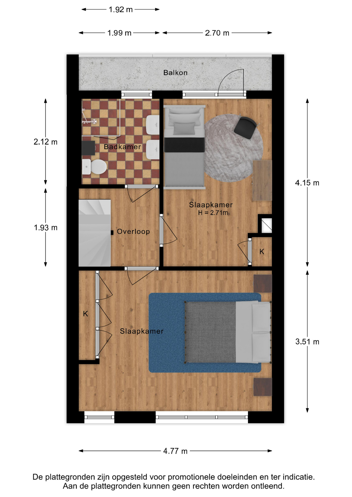 Op de tweede verdieping vind je een ruime overloop met wasmachine- en drogeraansluiting, en nog eens twee slaapkamers. Deze zijn flexibel in te richten — bijvoorbeeld als kinderkamers, werkkamer of logeerruimte. De gehele tweede verdieping is voorzien van knieschotten en een zolder, dus aan praktische bergruimte geen gebrek.